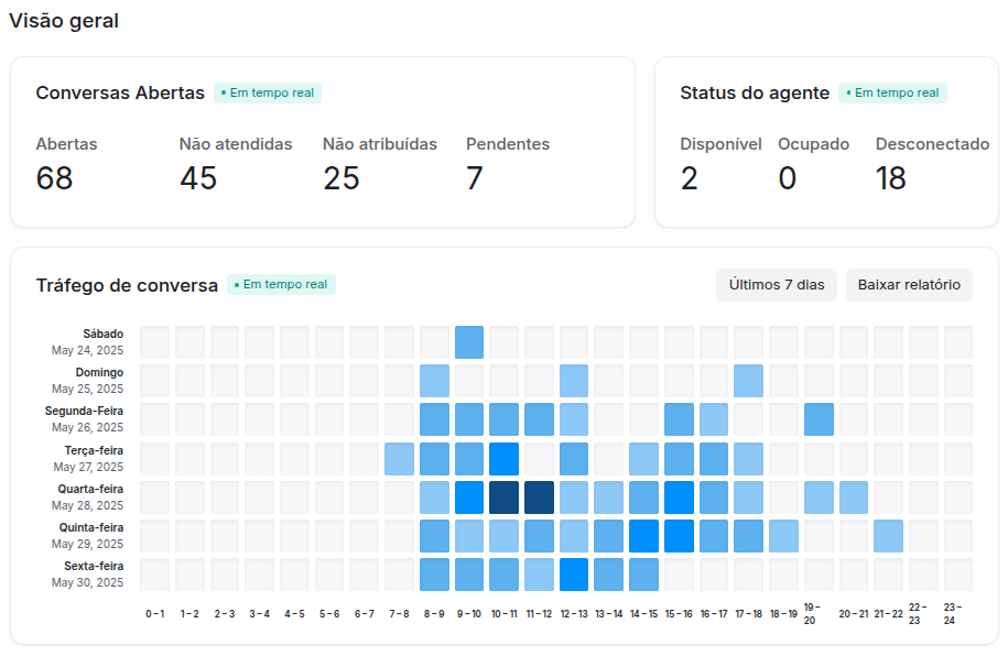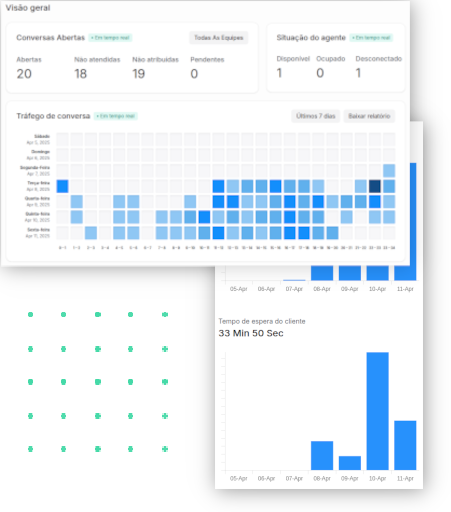 Veja o que está acontecendo atualmente com suas conversas e agentes, ou avalie quais marcadores ou caixas de entrada são os mais ativos e analise vários indicadores-chave de desempenho importantes – no seu painel do OmniVibe.