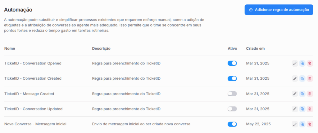A automação pode substituir e simplificar processos existentes que requerem esforço manual, como a adição de etiquetas e a atribuição de conversas ao agente mais adequado. Isso permite que o time se concentre em seus pontos fortes e reduza o tempo gasto em tarefas rotineiras.
