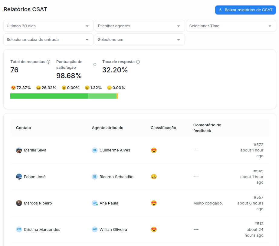 Habilite a pesquisa CSAT (Customer Satisfaction) para pedir automaticamente que seus clientes avaliem suas conversas com você. Veja seu relatório CSAT abrangente, quando quiser.